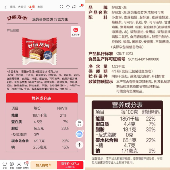 从营养成分表看,低糖好丽友派的碳水化合物含量为65.1g/100g,和普通好丽友派的65.7g/100g含量差异甚小,而热量、脂肪含量甚至高于普通好丽友。